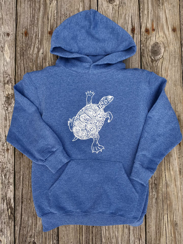 Kid's Hoodie featuring our local favorite, the Diamondback terrapin! 50% Cotton 50% Polyester for comfort and durability. Medium Weight fabric and cozy! Front pocket.